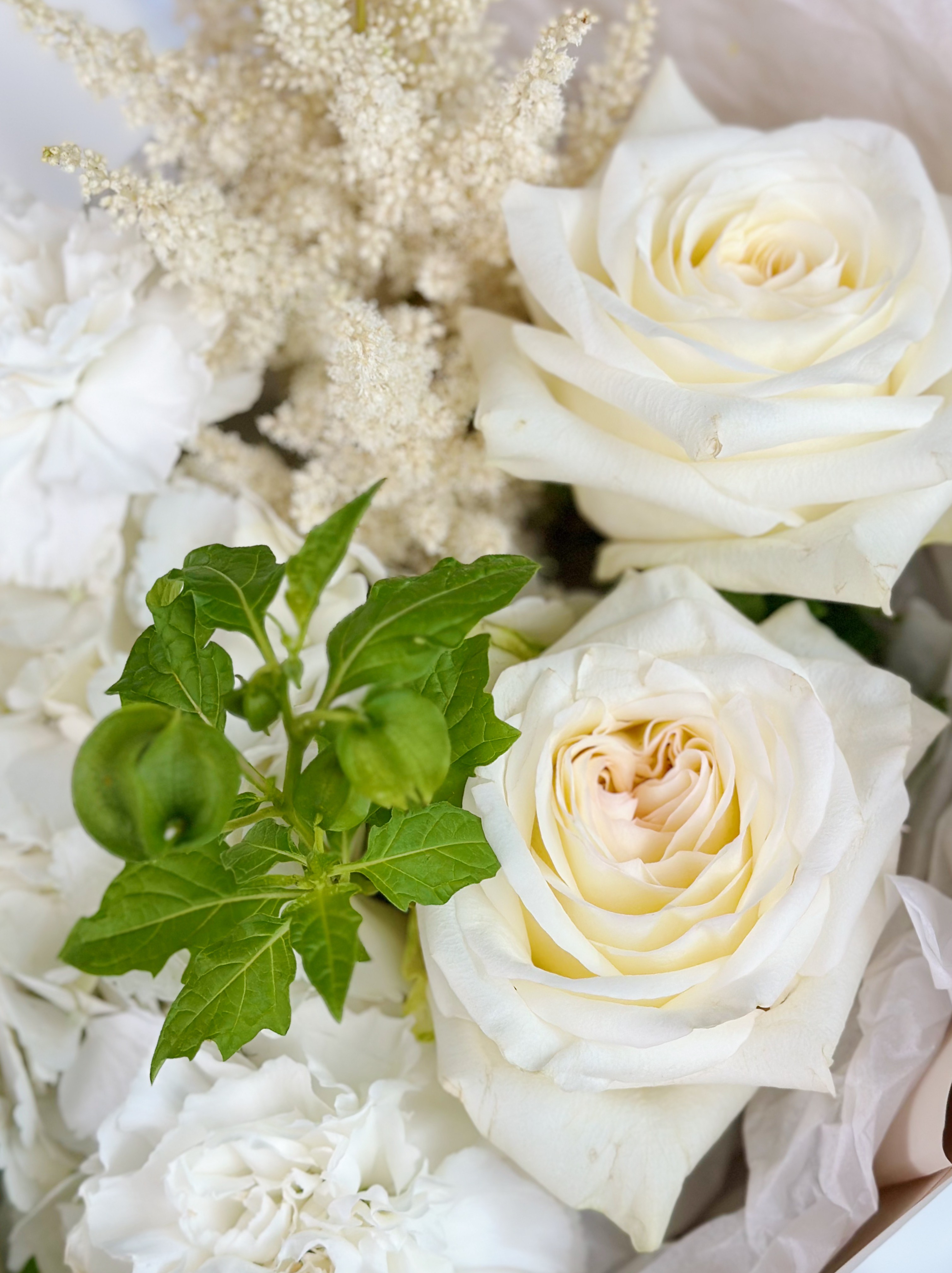 Гортензия - добавляет композиции объем и воздушность, создавая гармоничное сочетание с розами. Её изящные соцветия привносят в букет особую грацию.
