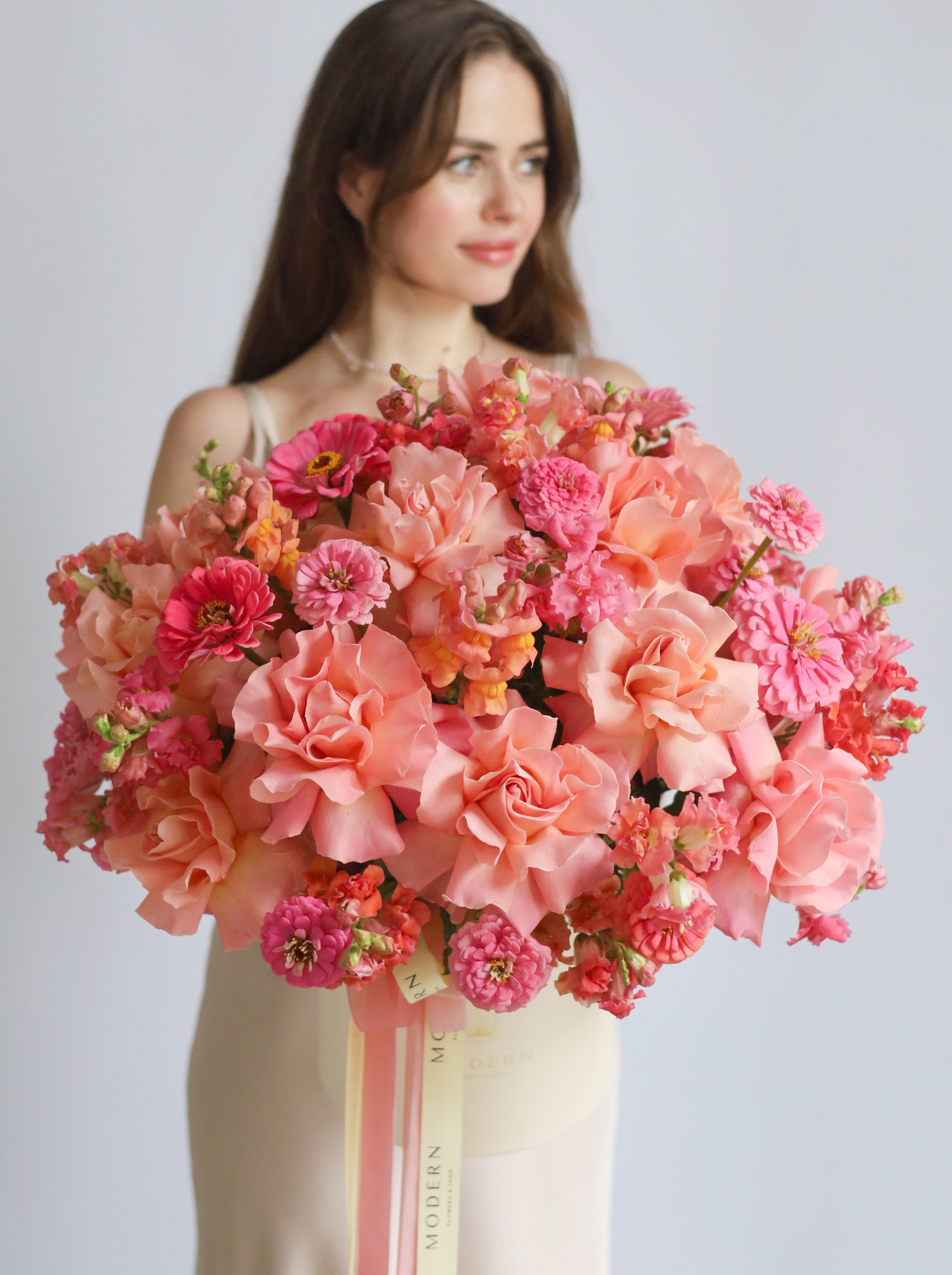 Цинния добавляет композиции яркости и объема, привнося в букет нотки природной свежести и жизнерадостности.