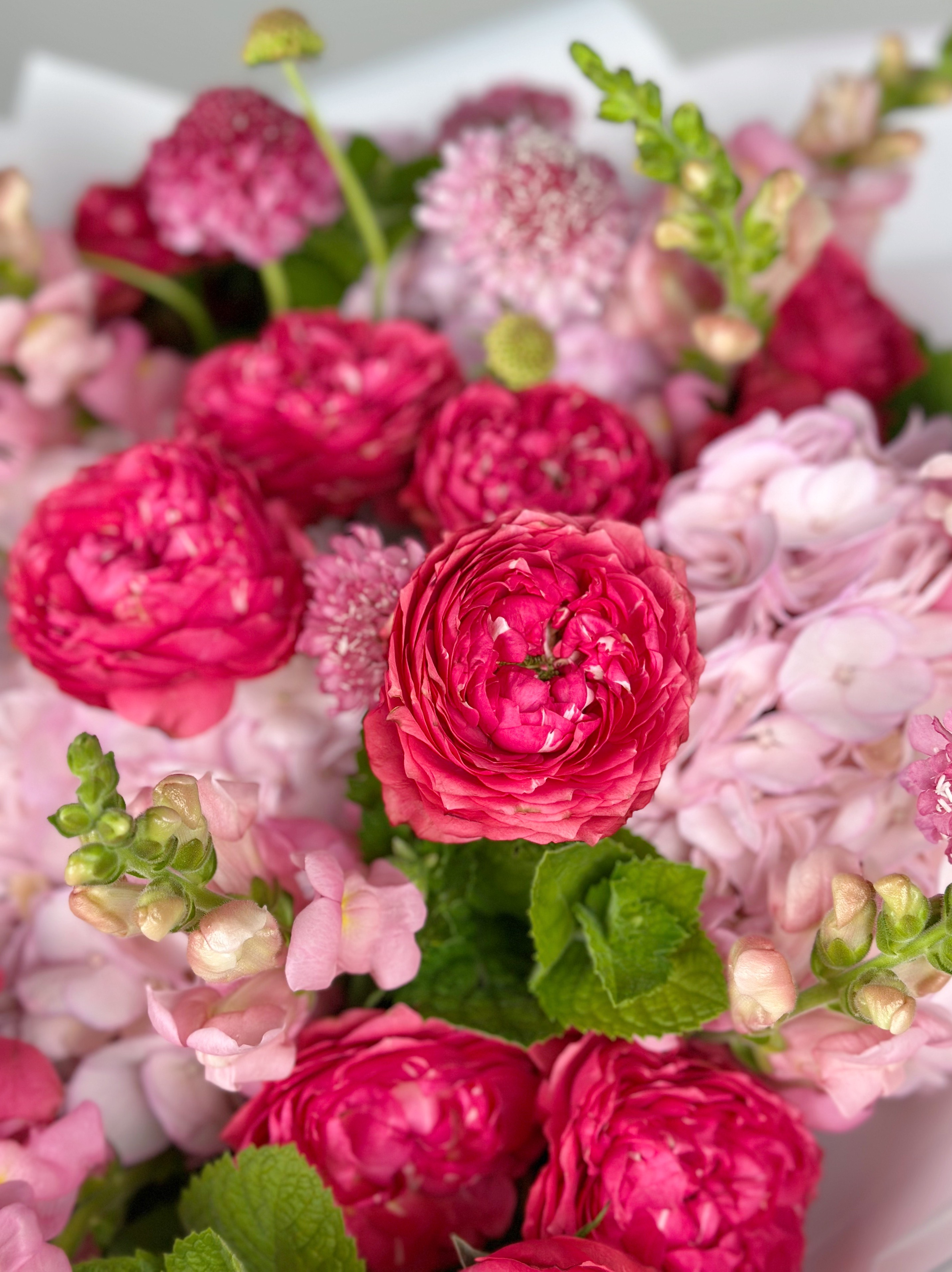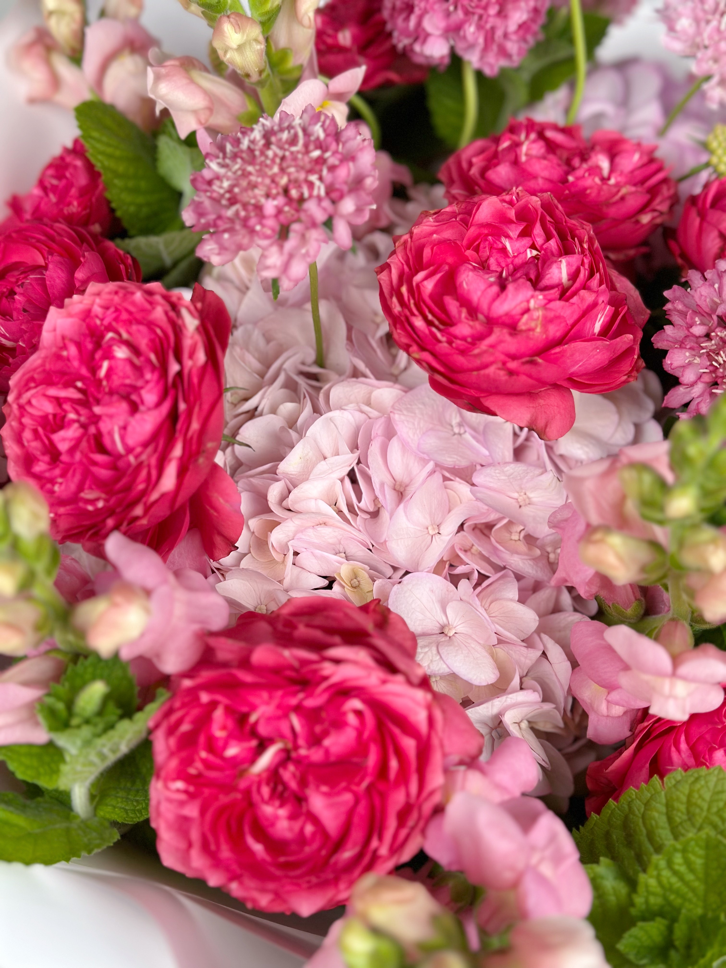 Большой букет с гортензией и кустовыми пионовидными розами