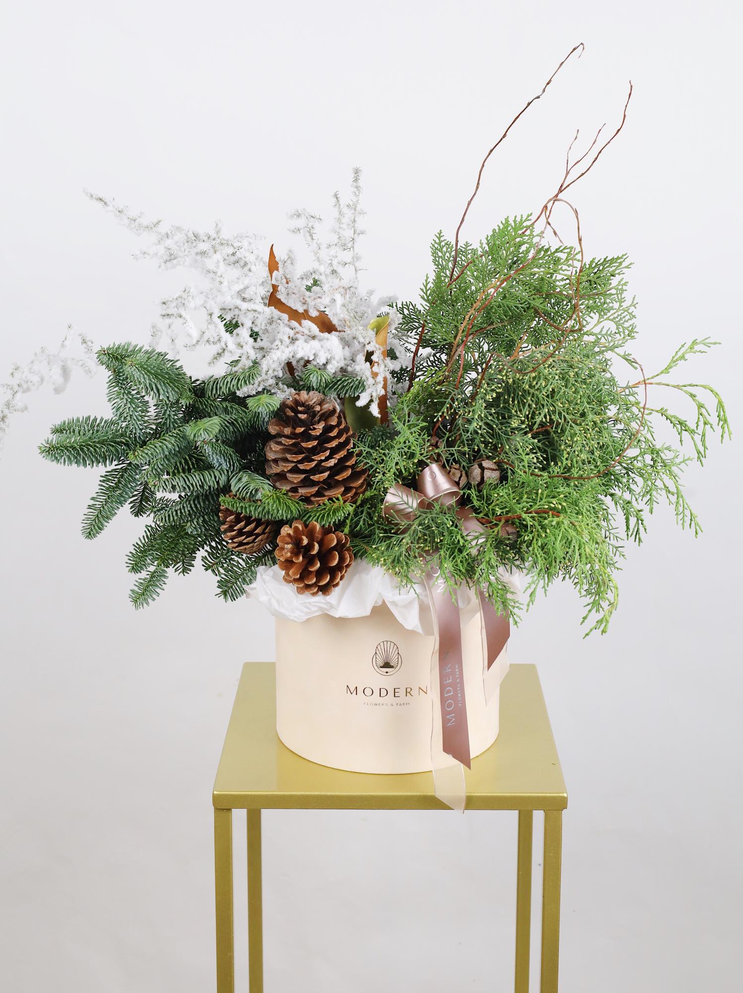 —ХВОЙНЫЙ МИКС В БАРХАТНОЙ КОРОБКЕ С ЗАСНЕЖЕННЫМ АСПАРАГУСОМ И БОЛЬШИМИ ШИШКАМИ