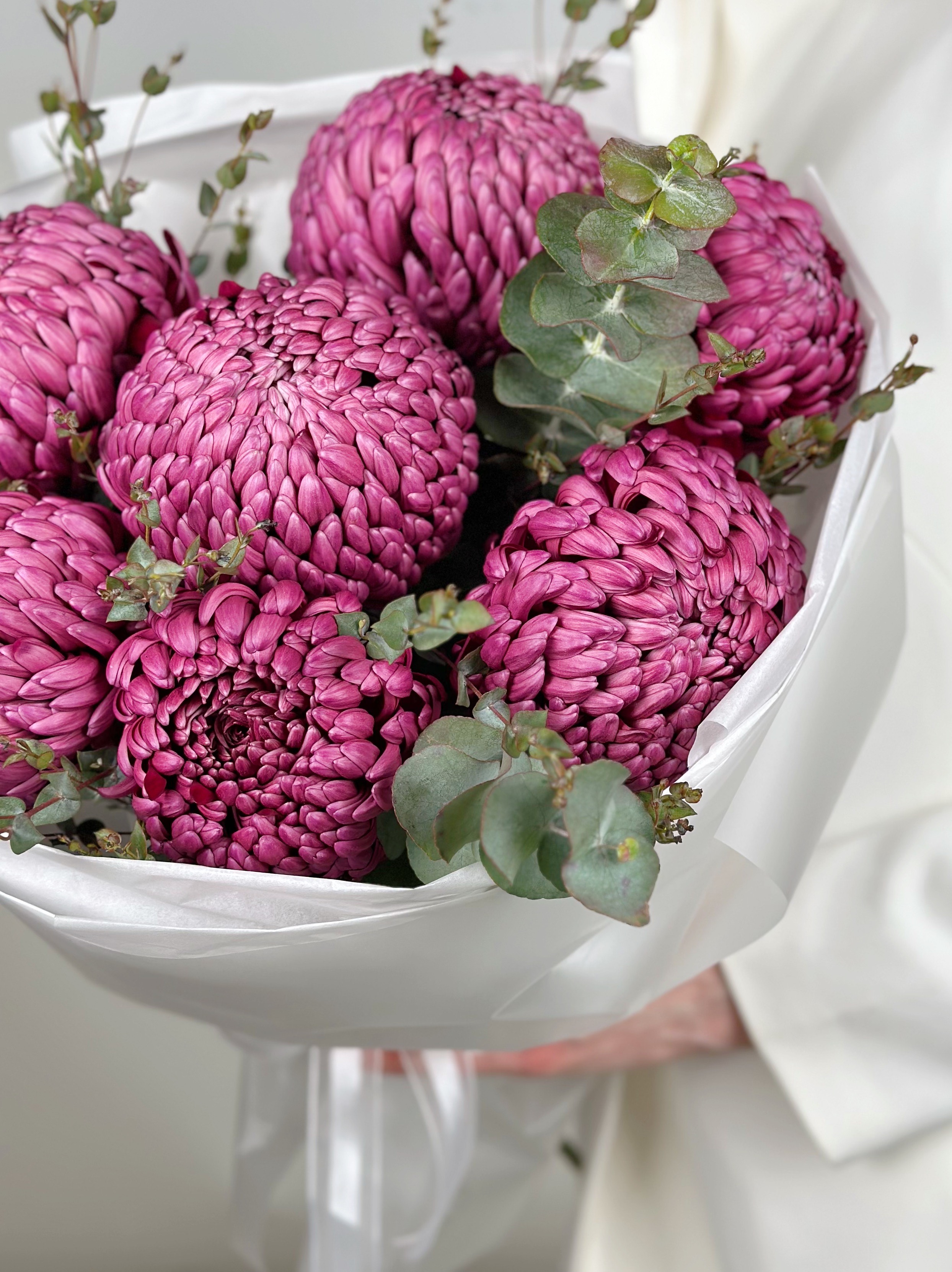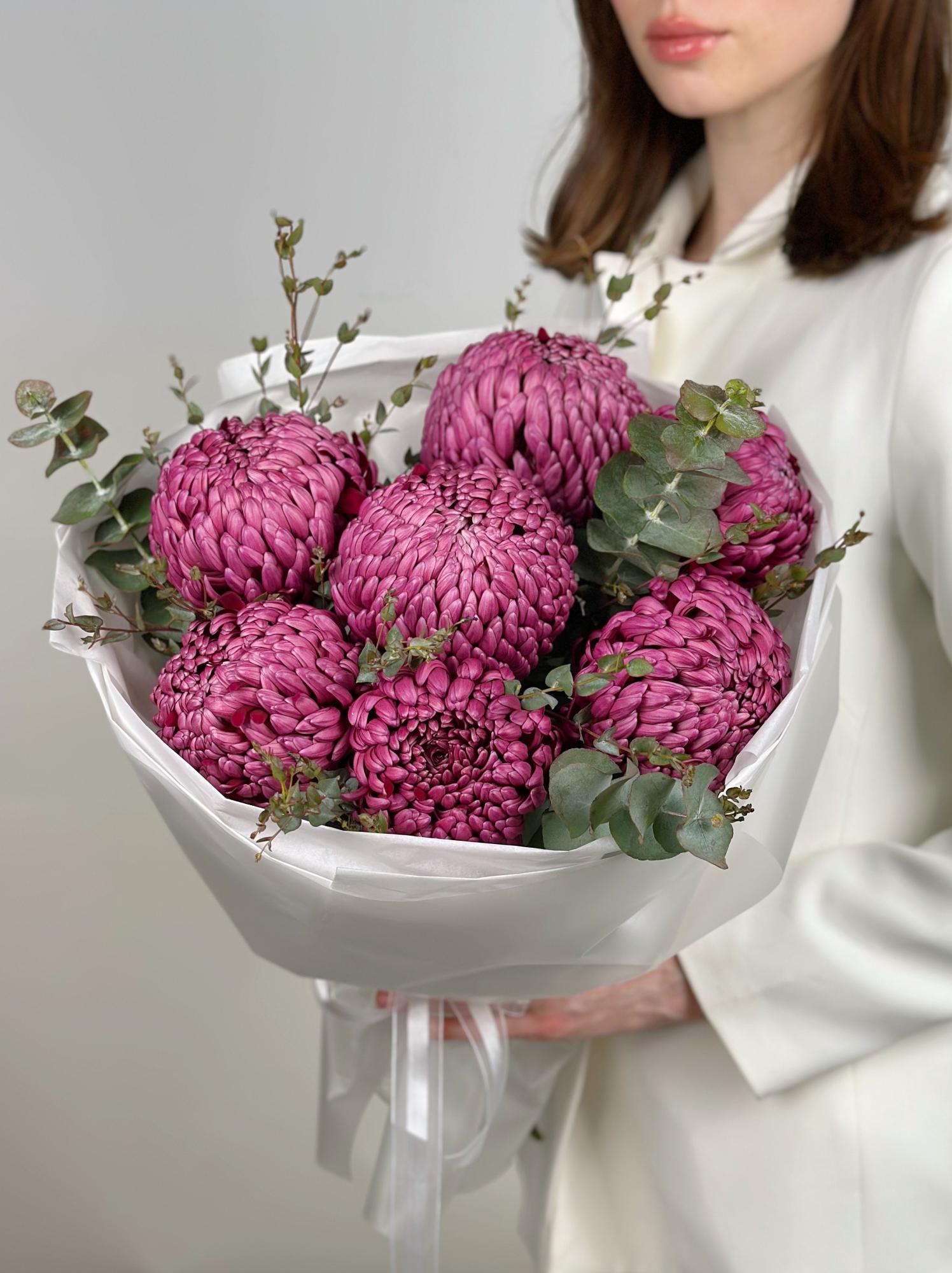 —КРУГЛЫЙ БУКЕТ С ХРИЗАНТЕМОЙ И ЭВКАЛИПТОМ