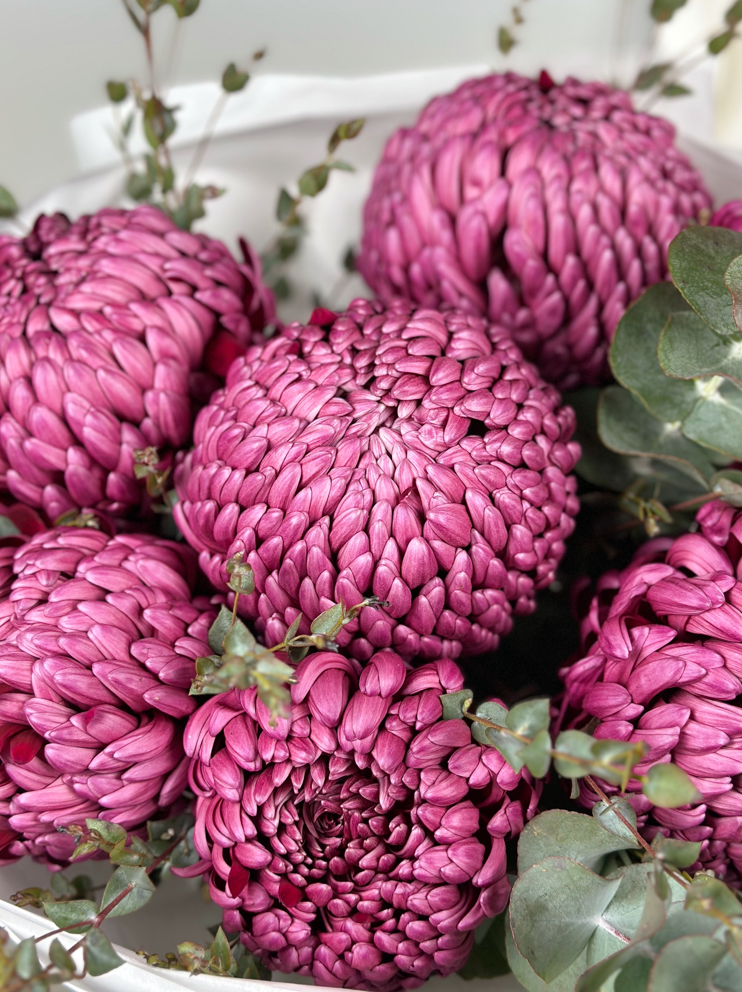 КРУГЛЫЙ БУКЕТ С ХРИЗАНТЕМОЙ И ЭВКАЛИПТОМ