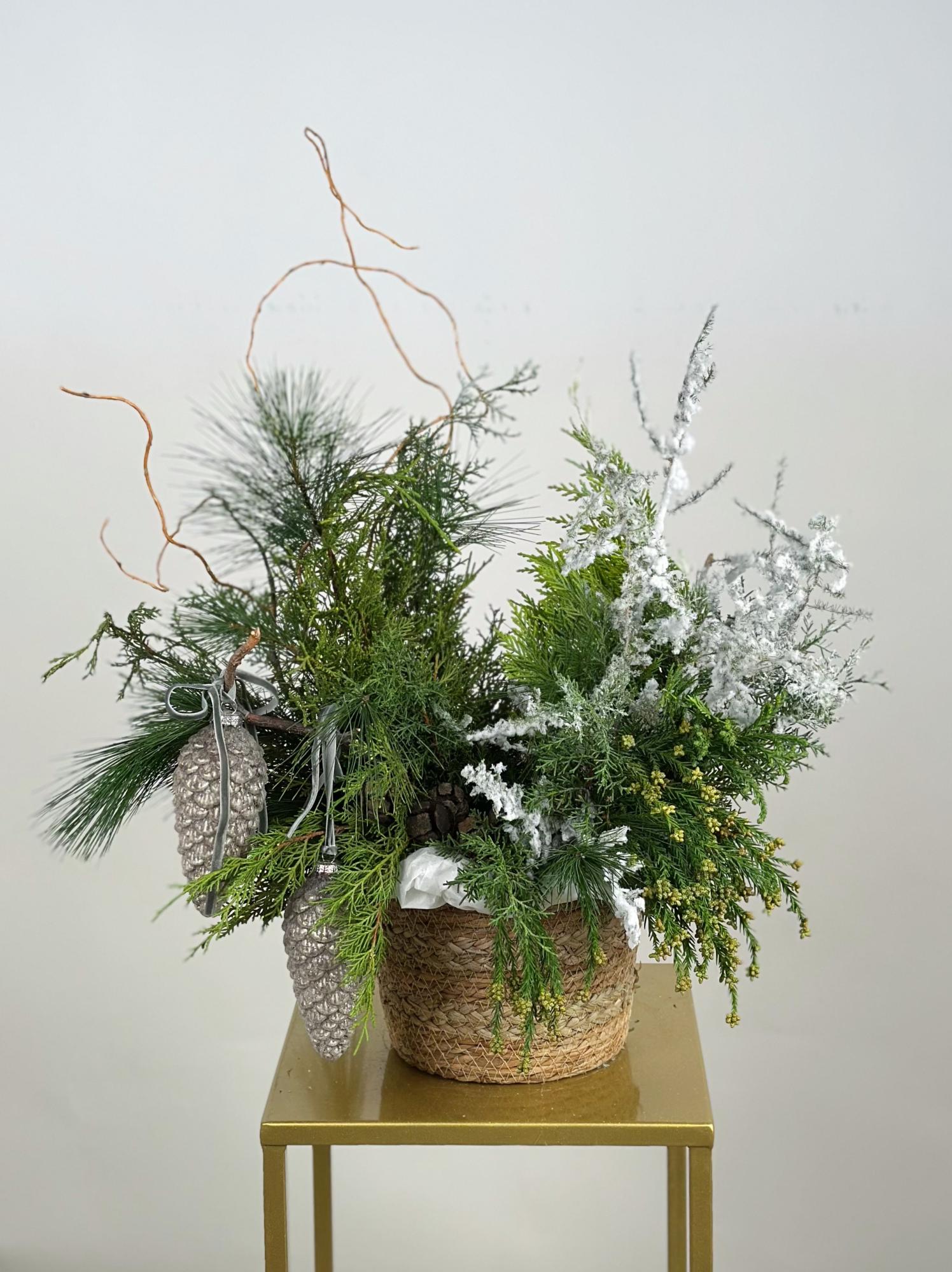 —МИКС ХВОИ И ЗАСНЕЖЕННОГО АСПАРАГУСА В КОРЗИНЕ С ДЕКОРОМ