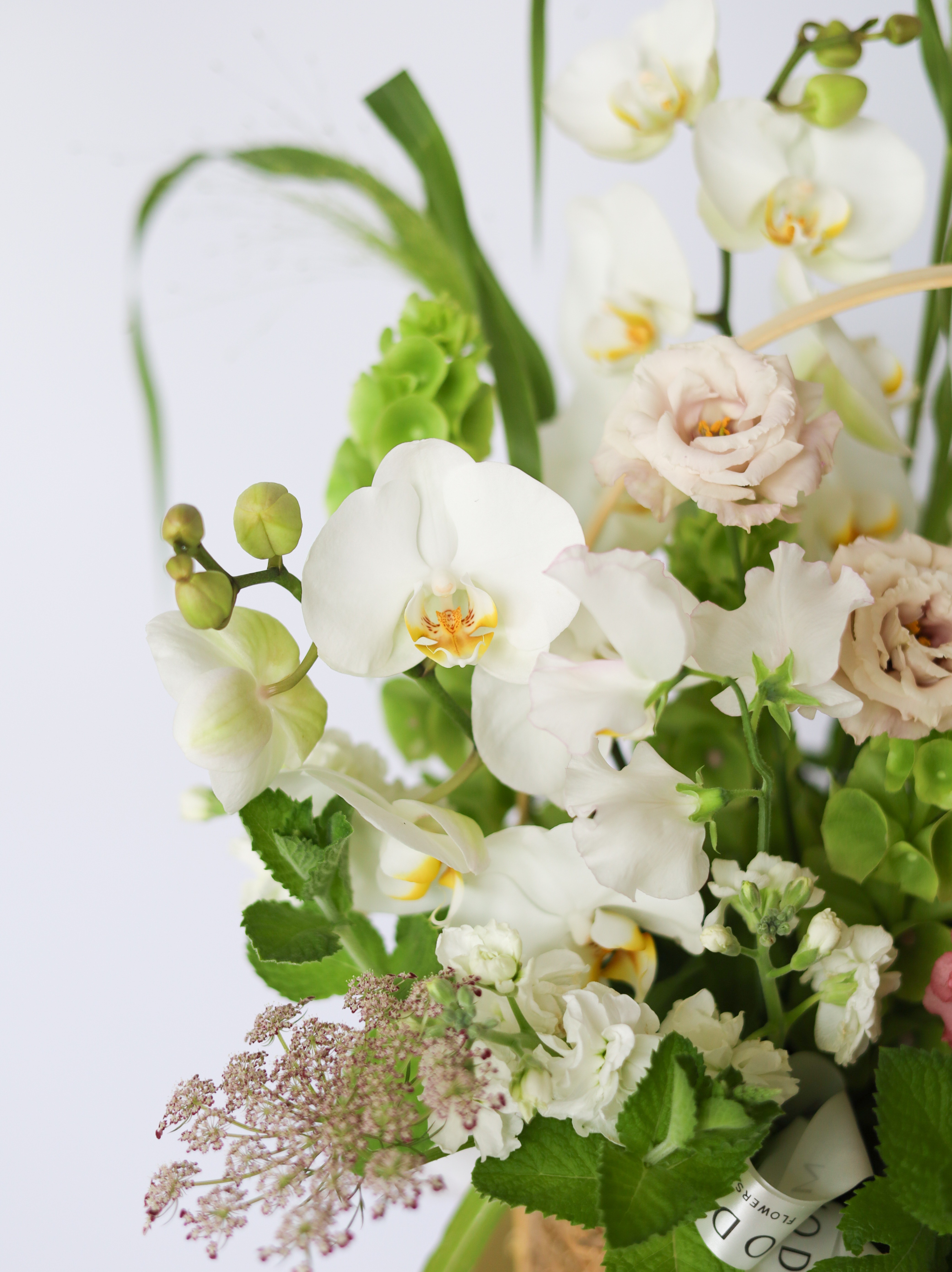 Представляем вашему вниманию утонченную цветочную композицию, где элегантность орхидей гармонично сочетается с очарованием сезонных летних цветов.