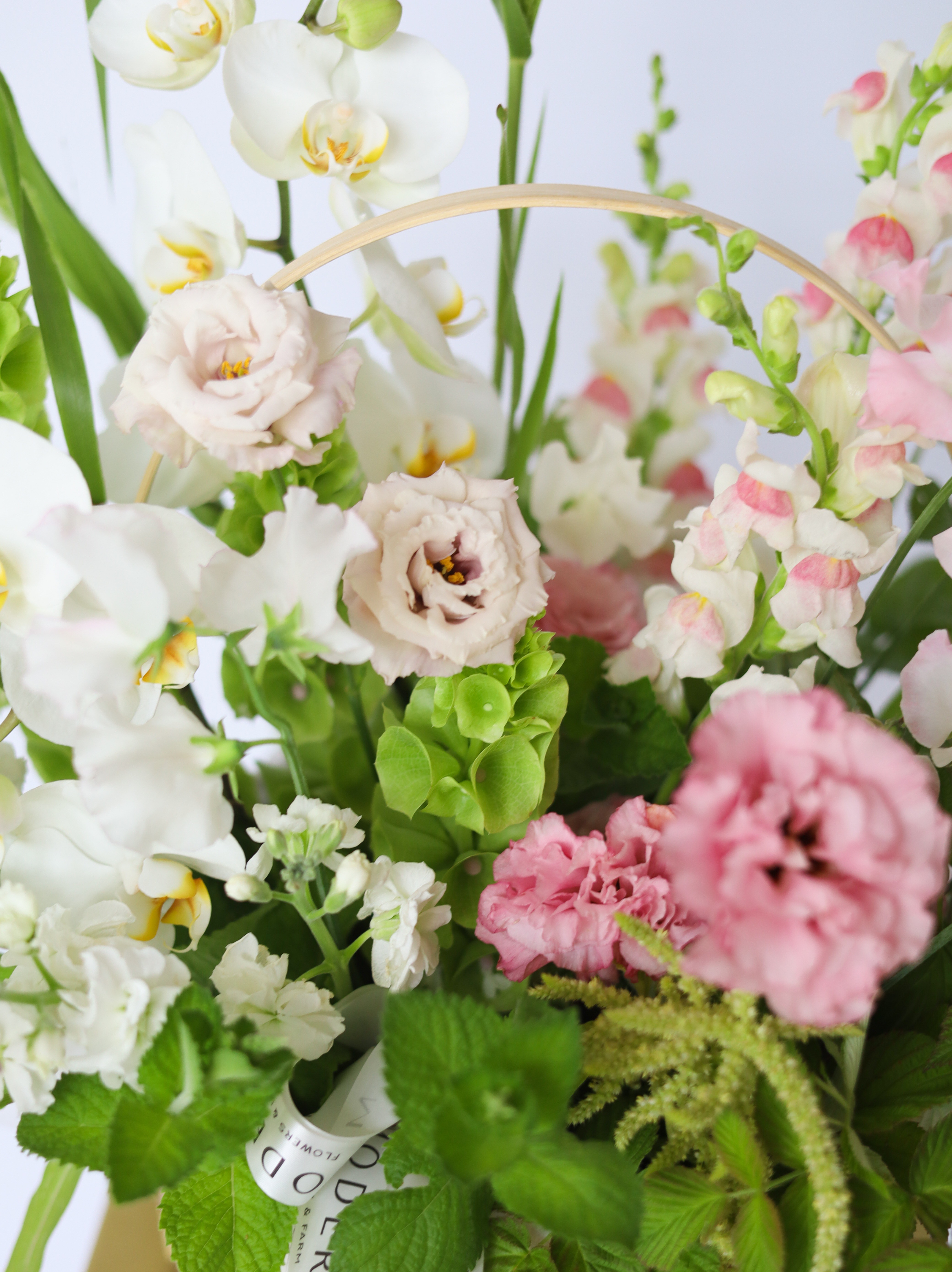 —НЕЖНАЯ КОРЗИНА С ОРХИДЕЕЙ И СЕЗОННЫМИ ЛЕТНИМИ ЦВЕТАМИ