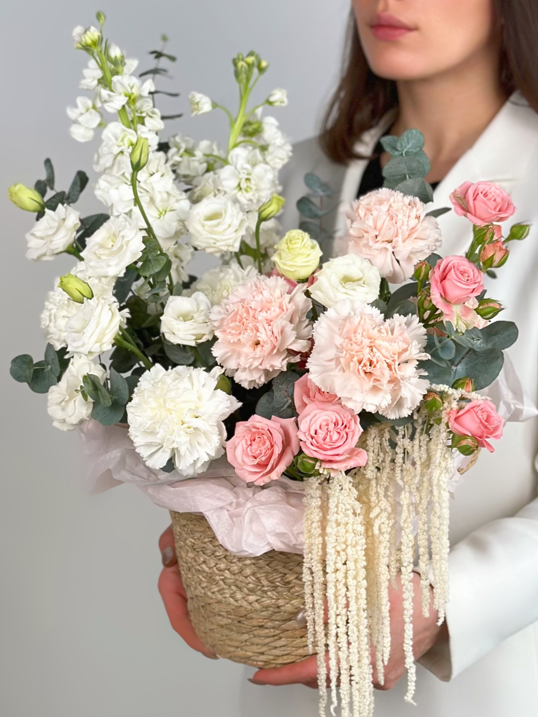 —ПИОНОВИДНАЯ КУСТОВАЯ РОЗА, МАТТИОЛА, ЭУСТОМА В ПЛЕТЕНОЙ КОРЗИНЕ
