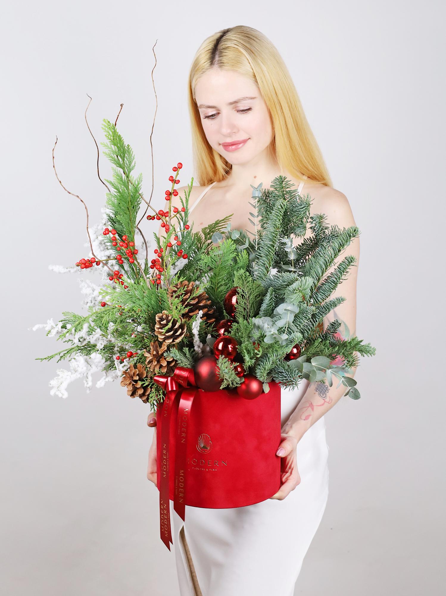 —ТОРЖЕСТВЕННАЯ ХВОЙНАЯ КОМПОЗИЦИЯ В БАРХАТНОЙ КОРОБКЕ
