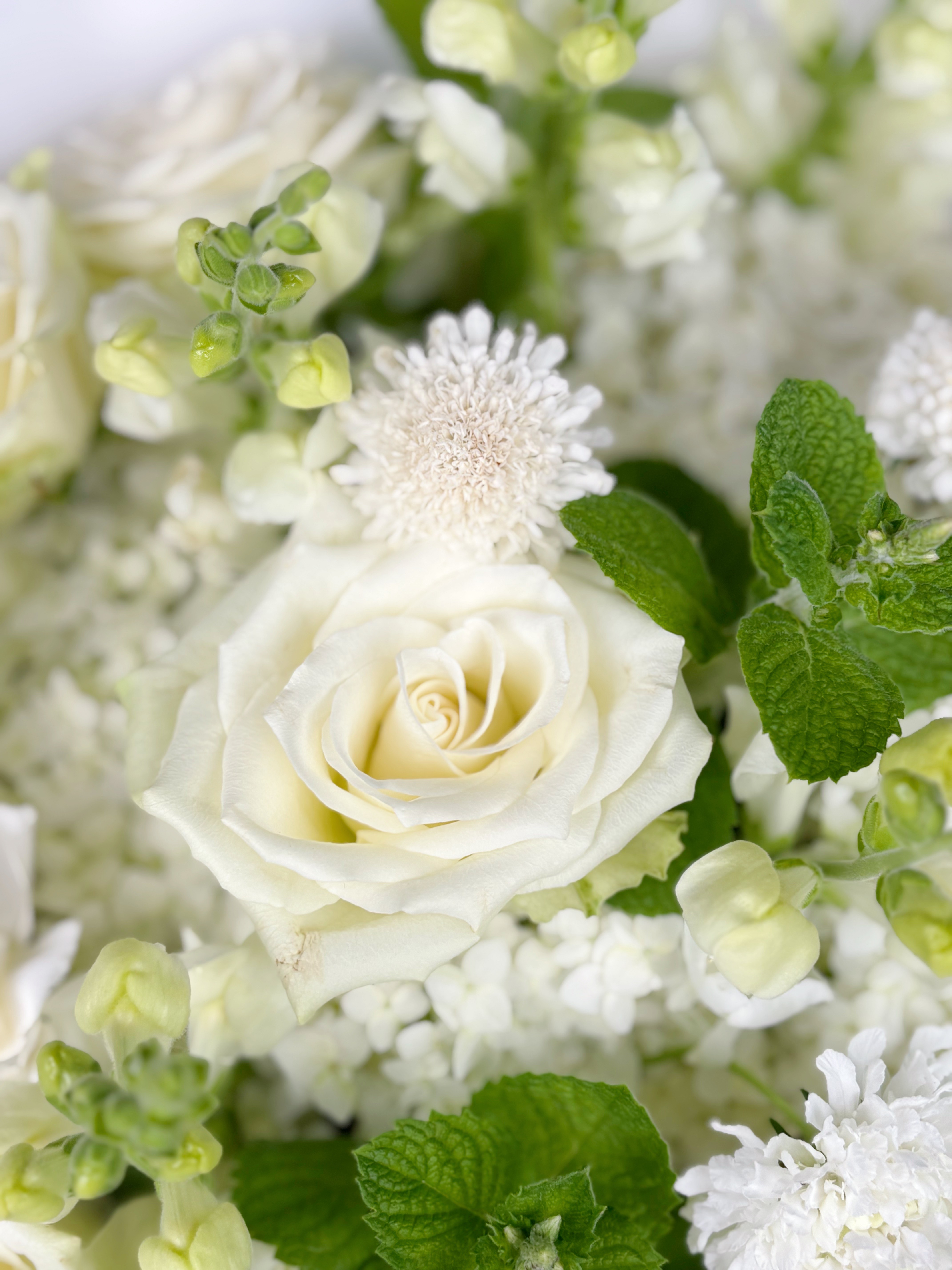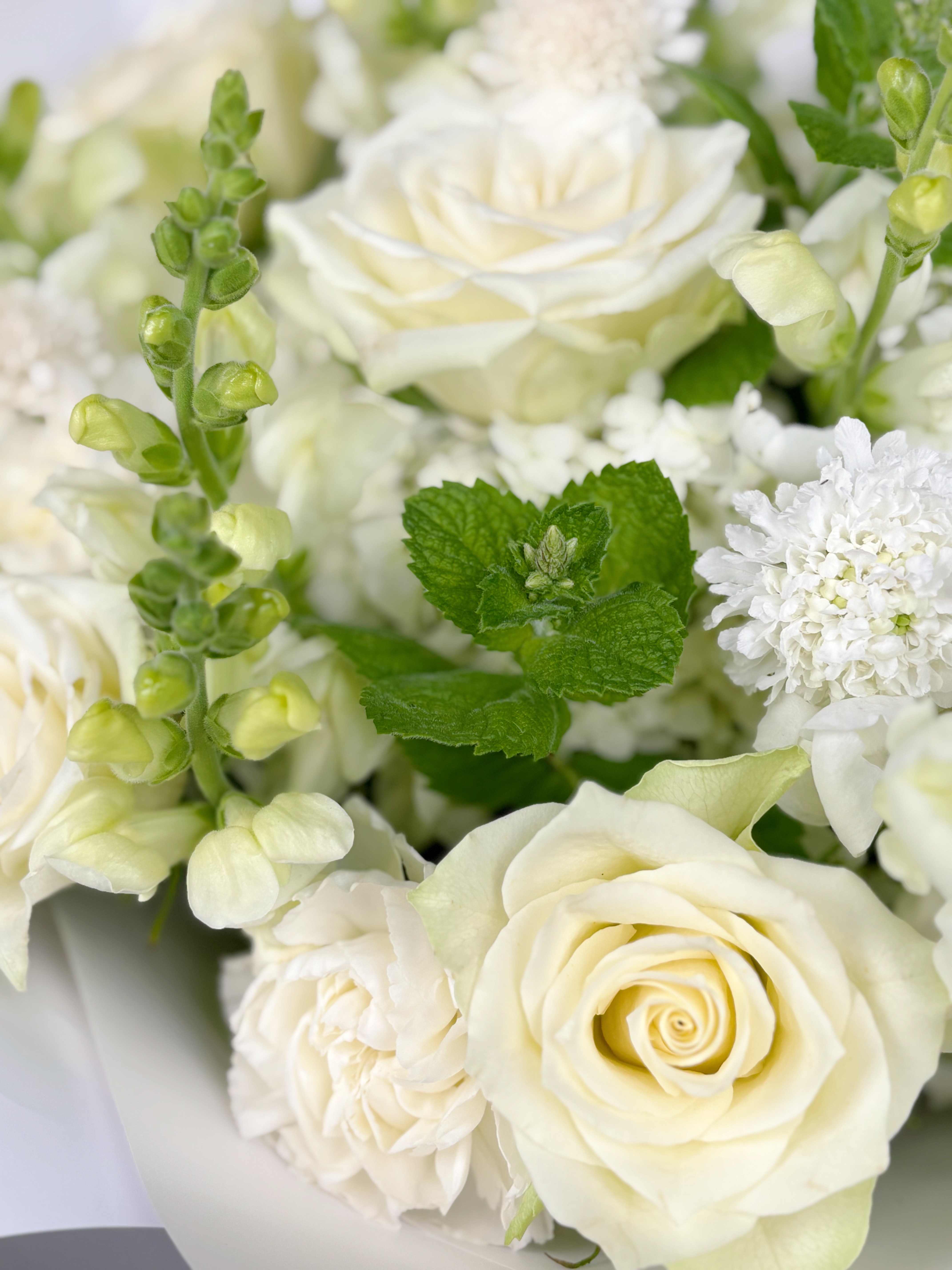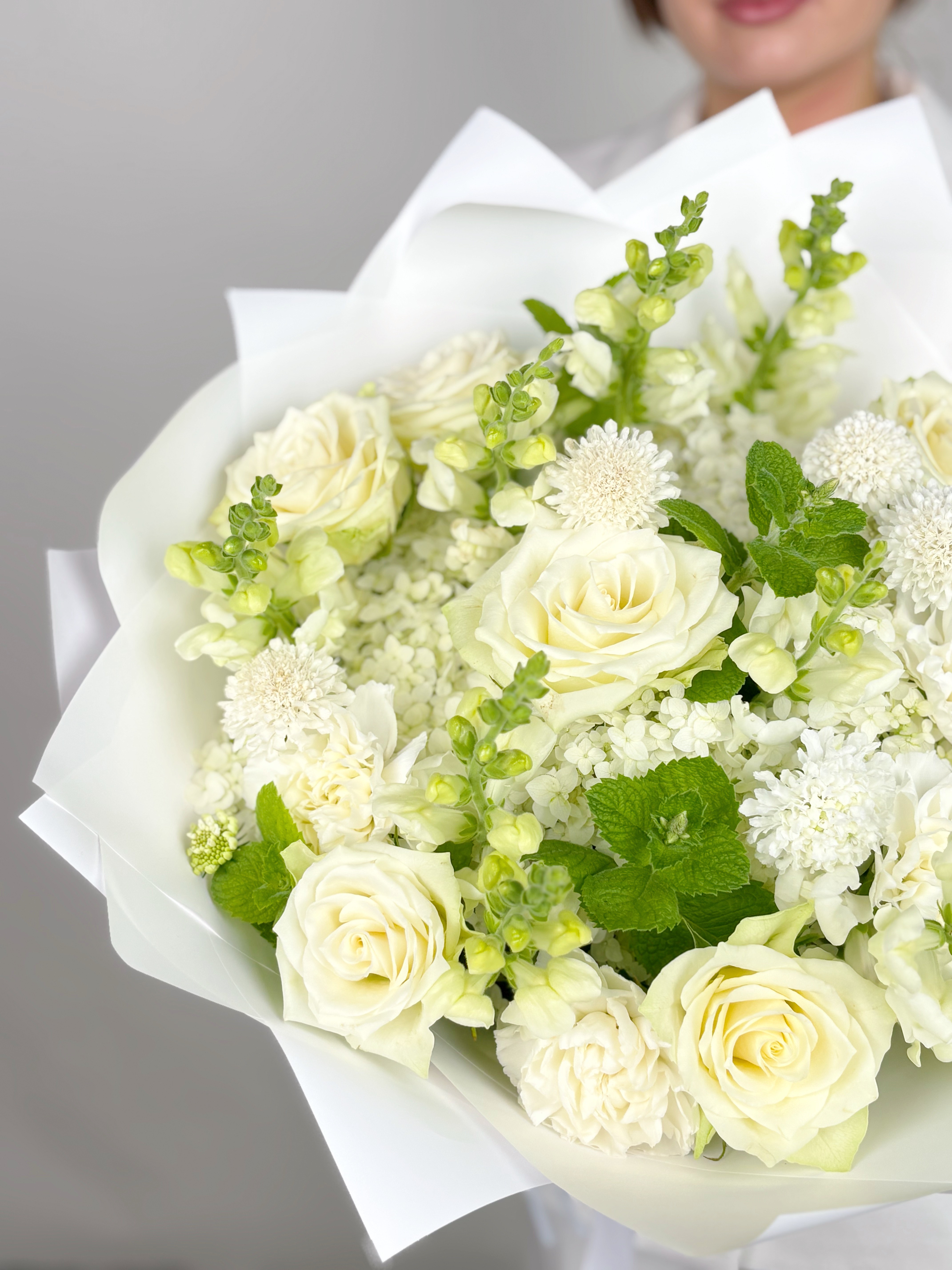Представляем вашему вниманию воплощение элегантности и утонченности — изысканный букет в белоснежных тонах. В центре композиции — роскошные пионовидные розы и пышные соцветия гортензии, создающие неповторимую симфонию природной красоты.