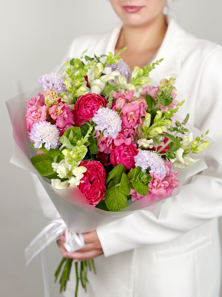 БУКЕТ С ПИОНОВИДНОЙ РОЗОЙ, СКАБИОЗОЙ И МЯТОЙ